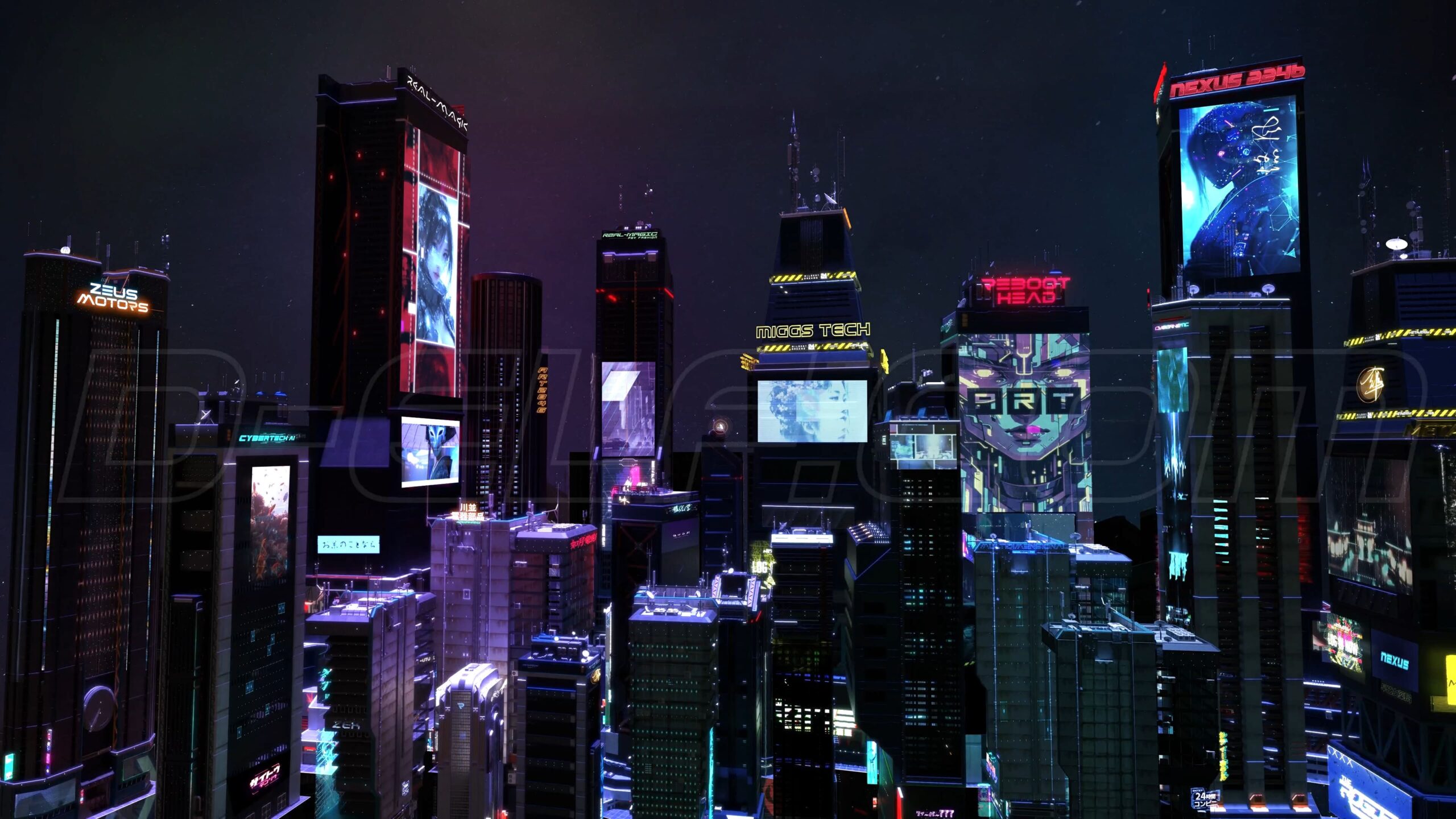 アニメ風の動く夜の都市、ビル群やネオン広告などの背景動画素材です。